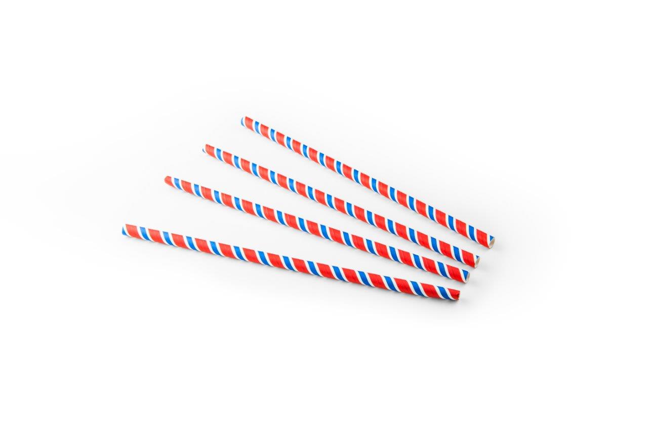 Drinkrietje papier rood,wit,blauw gestreept, BIO-FSC, Ø 8 mm x 23cm, 100 stuks