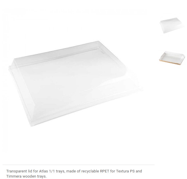Transparent lid for Atlas 1/1 trays, made of recyclable RPET for Textura PS and Timmera wooden trays.