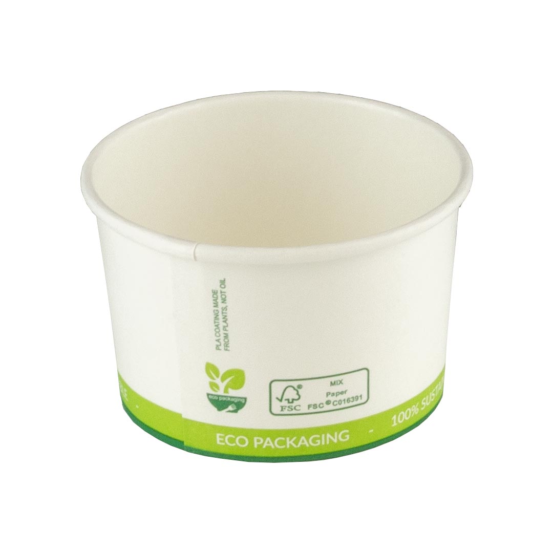 De FSC kartonnen ijsbeker 4oz/120ml met PLA coating is voornamelijk geschikt voor het serveren van een of twee bolletjes ijs. Combineer de duurzame ijsbekers met onze afbreekbare ijslepels.