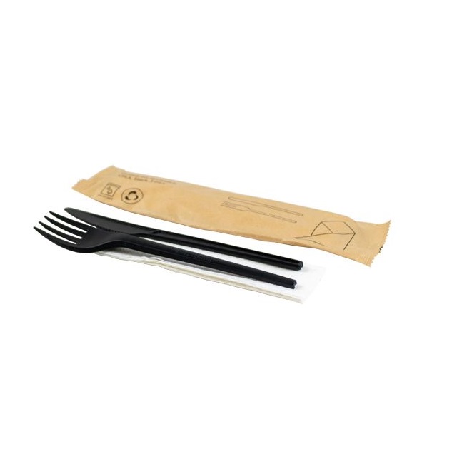 Bestekset CPLA zwart mes/vork/servet wit 2-ply, Re-usable, 250 stuks