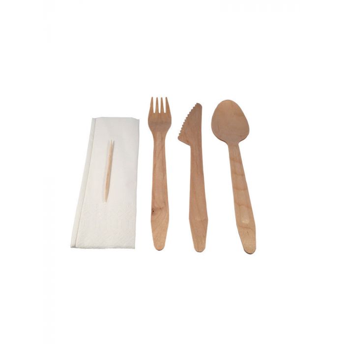 Bestekset hout wit (mes-vork-lepel-tandenstoker-servet), 4 x 100 stuks