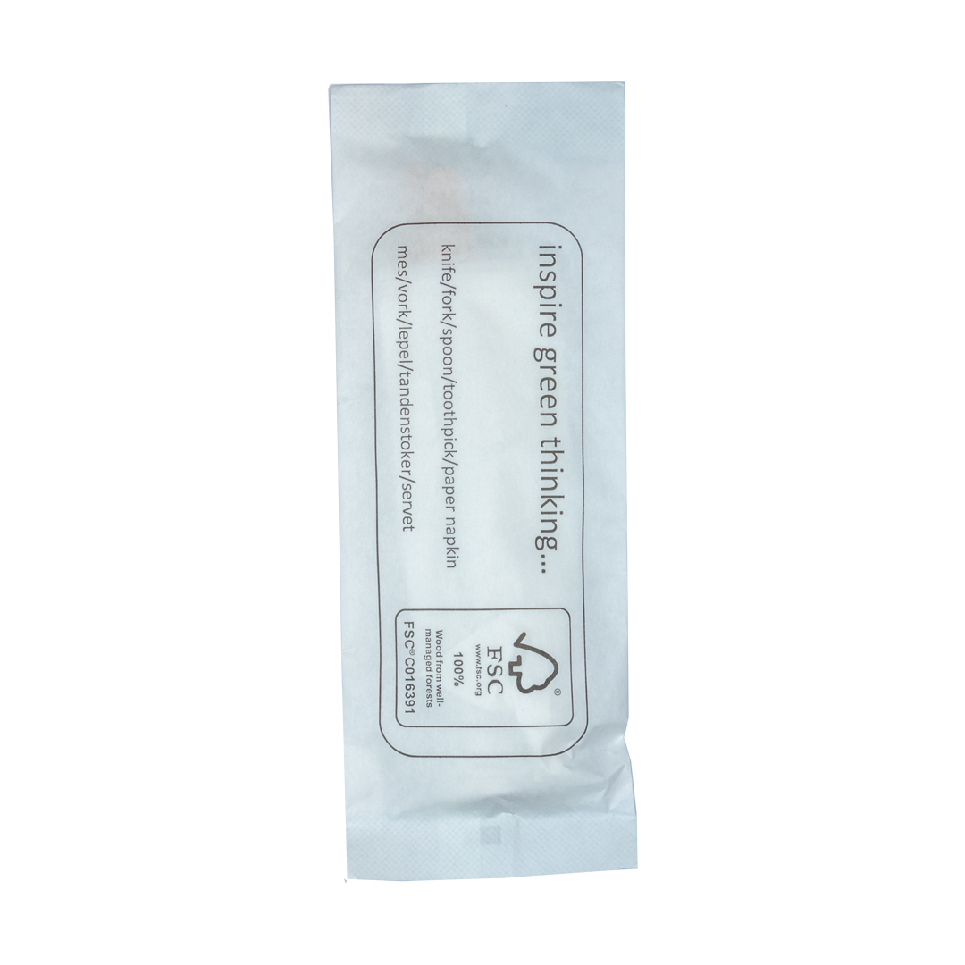Deze FSC® bestekset bestaat uit een houten mes, lepel, vork, tandenstoker en bruin servet. FSC® houten bestek heeft een natuurlijke uitstraling en kunt u gebruiken voor zowel koude als warm gerechten. Erg handig om mee te geven bij uw takeaway maaltijden.
