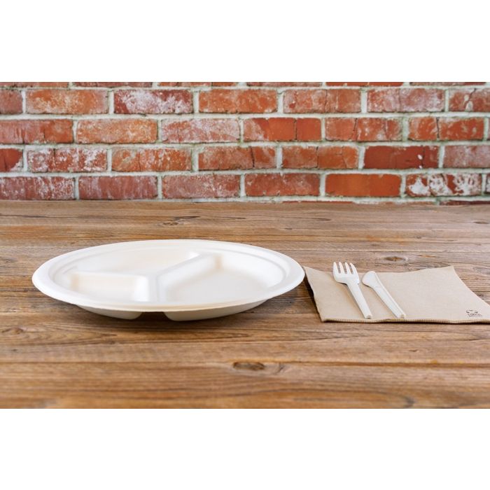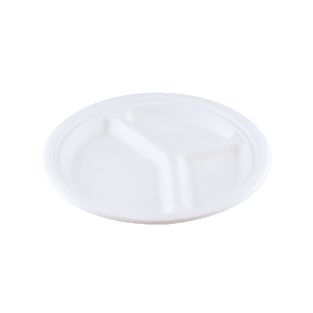 Suikerriet bord 23cm Ø 3-vaks is stevig en kan uitstekend worden gebruikt voor verschillende kleine gerechten, zoals voor- en hoofdgerechten. Handig is de 3-vaks verdeling, zo kunt u de ingrediënten van uw gerecht gemakkelijk scheiden. Deze suikerrietborden zijn een goed alternatief voor plastic bordjes, zeer handig bij bijvoorbeeld een barbecue of feestje. U kunt de suikerriet borden ook combineren met ons wegwerpbestek.