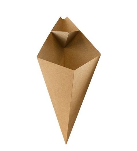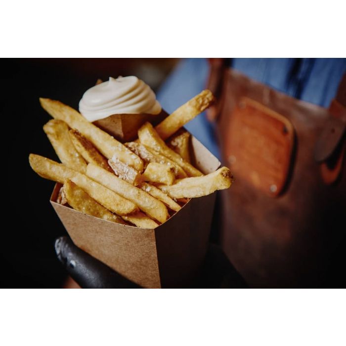 Presenteer een middelgrote friet of snacks in onze duurzame kartonnen frietzak en geef zo een ambachtelijke look aan uw producten. Het sausvakje boven de friet voorkomt dat men zonder saus komt te zitten en voorkomt bovendien knoeien. Combineer onze duurzame FSC® frietzakken met houten frietvorkjes en eco servetten.