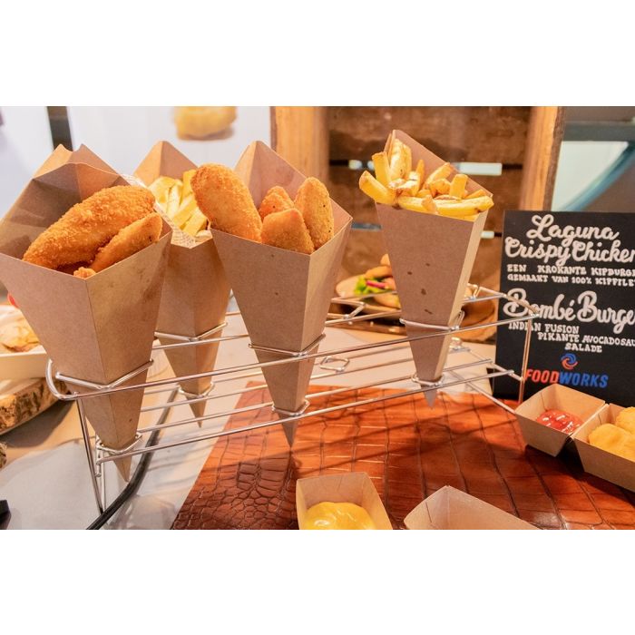 De RVS frietzakhouder is geschikt voor het neerzetten van totaal 6 frietzakken die bijvoorbeeld zijn gevuld met friet. Dit is ideaal om te handen vrij te houden en de gevulde puntzakken te presenteren. De puntzakken uit ons assortiment zijn uitstekend te gebruiken met deze frietzakhouder.