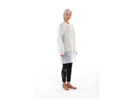 Bezoekersjas non woven, wit XL 30gr met drukknopen. Inhoud 100 stuks.