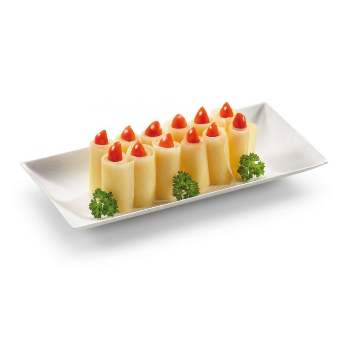 Suikerriet bord "Komodo" 180x90mm heeft een modern design en kan worden gebruikt voor de presentatie van verschillende amuses. Bovendien biedt het een milieuvriendelijk alternatief voor plastic amuse bordjes.
