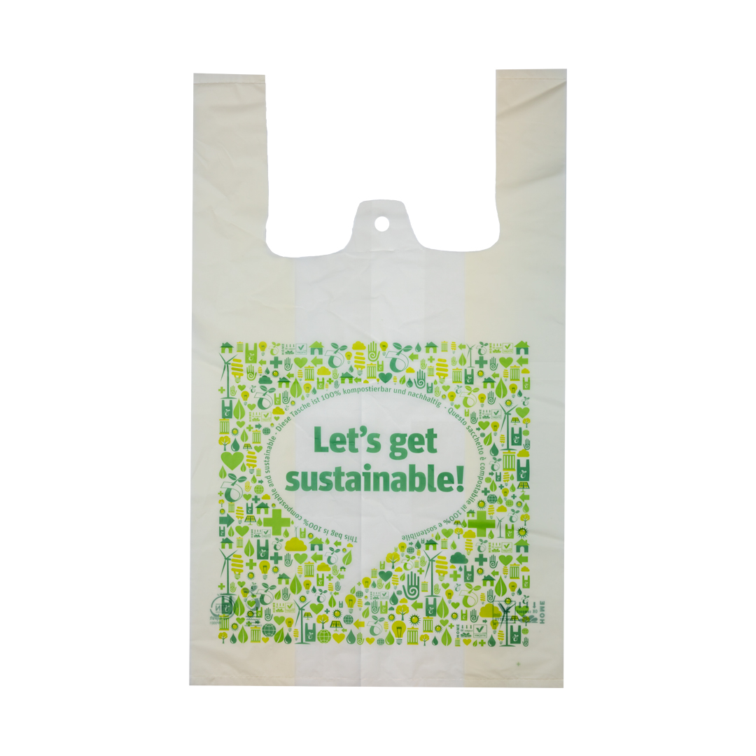 Gebruik de MaterBi draagtas voor uw kleine boodschappen en takeaway. Ook kunnen de draagtassen gebruikt worden in de retail, het biedt een milieuvriendelijk alternatief voor plastic tasjes.