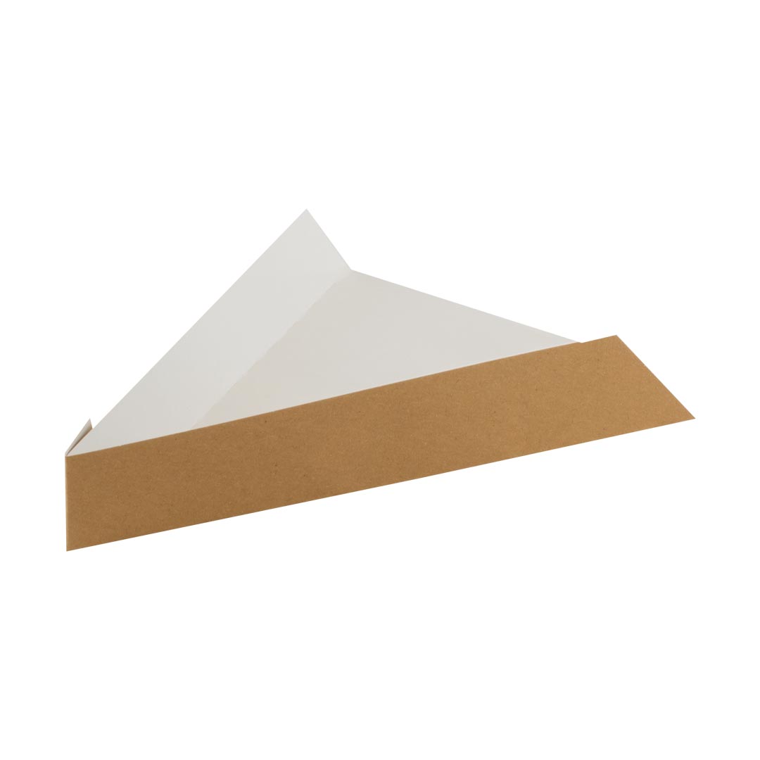 De kraft kartonnen pizza slice houder is gemaakt van gerecycled karton en kan worden gebruikt als meegeef verpakking voor een losse pizza slice. Op deze manier voorkomt men het branden van de handen aan de vers bereide pizzaslice. Dit product wordt veel gebruikt op festivals en in pretparken.