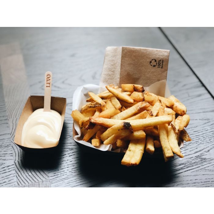 Gebruik het FSC® kraft snackbakje A1 voor het uitgeven van kleine snacks of bijvoorbeeld als sausbakje. Het FSC® kartonnen snackbakje is gemaakt van kraft karton en is voorzien van een biologisch afbreekbare PLA (maiszetmeel) coating wat zorgt voor vocht en vetbestendigheid. Met dit FSC® kraft kartonnen bakje geef je jouw lekkernijen de trendy streetfood look.