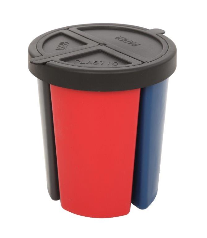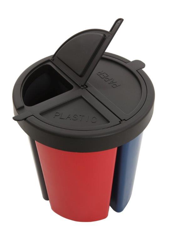 Set bestaande uit drie losse recycling compartimenten en een afsluitbaar deksel van kunststof. Een compartiment (blauw) van 7,5 liter voor papier en twee compartimenten (rood en grijs) van elk 3,75 liter voor plastic en restafval. Als inzet te gebruiken voor de 15 liter metalen papierbak (VB 100100). , VB 704156, L 260 b 290 h 300 ø 260, mm