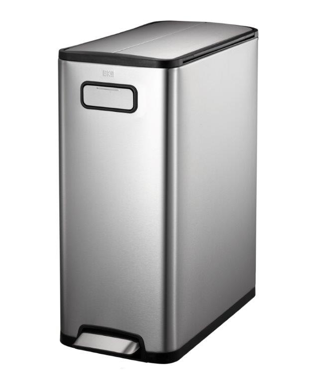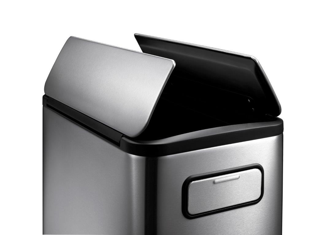 Stijlvolle pedaalemmer voor afvalscheiding van geborsteld RVS met fingerprint proof coating en 2 kunststof binnenemmers (2x 20 liter). Door het slanke design en het pedaal aan de smalle zijde uitermate geschikt voor smalle ruimten. Het geruisloos sluitend deksel opent in twee delen waardoor het ook gemakkelijk onder werkbladen past. Door het handvat aan de voorzijde en de ingebouwde wielen is de pedaalemmer makkelijk te verrijden. , VB 937740, L 532 b 275 h 660, mm