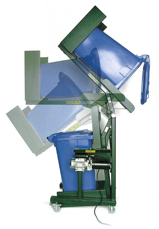 Mobiele hef-kantelinstallatie bestemd voor een 240 ltr container. Elektrische aansluiting 220 V/ 370 W. Hefhoogte 135 cm, maximale hefcapaciteit 80 kg. Tijdens kantelen maximale hoogte 260 cm. , VB 970020, L 900 b 900 h 1350, mm