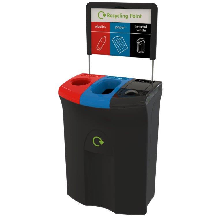 Recycling unit van UV-bestendig rotatiegegoten medium density polyethyleen (MDPE) voorzien van gekleurde deksels en bord om de afvalstromen aan te duiden (geschikt voor A3 poster). Zeer sterk en duurzaam. Het grote capaciteit afvalscheidingstation met discreet afvalzakhoudsysteem heeft een gat Plastics (30%), een opening Paper (40%) en een lift deksel General Waste (30%). Door zijn slanke ontwerp ideaal voor smalle gangen in scholen en kantoren. Andere configuraties op aanvraag. , VB 719709, L 400 b 600 h 1460, mm
