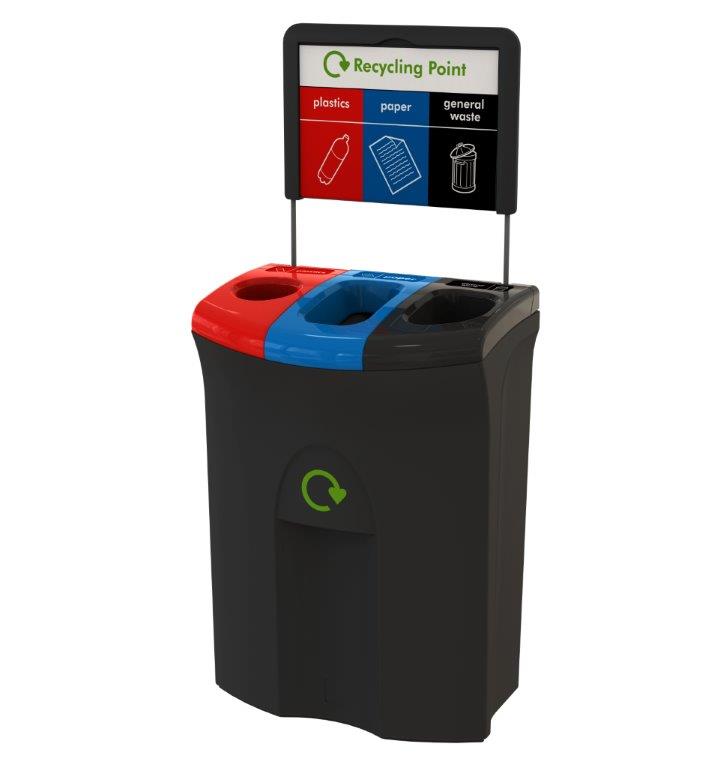 Recycling unit van UV-bestendig rotatiegegoten medium density polyethyleen (MDPE) voorzien van gekleurde deksels en bord om de afvalstromen aan te duiden (geschikt voor A3 poster). Zeer sterk en duurzaam. Het grote capaciteit afvalscheidingstation met discreet afvalzakhoudsysteem heeft een gat Plastics (30%), een opening Paper (40%) en een opening General Waste (30%). Door zijn slanke ontwerp ideaal voor smalle gangen in scholen en kantoren. Andere configuraties op aanvraag. , VB 719693, L 400 b 600 h 1460, mm