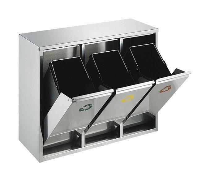 Recycling afvalbak van mat RVS voorzien van 3 kunststof binnenbakken (3x 15 ltr), die eenvoudig te legen zijn via de voorzijde van de afvalbak. Geschikt voor wandmontage. , VB 710423, L 270 b 705 h 565, mm