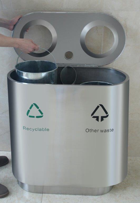 Recycling afvalbak van mat RVS met Fingerprint Proof coating. Voorzien van dubbele open inworpopening en metalen binnenemmers. , VB 667796, L 350 b 750 h 810, mm