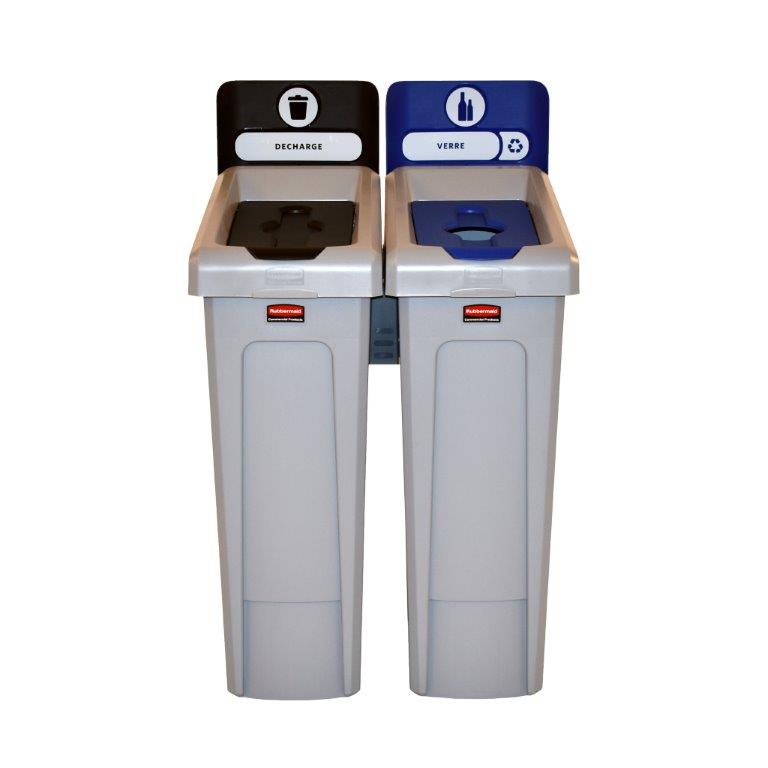 Compleet Slim Jim Recyclingstation voor twee afvalstromen. De set bestaat uit twee koppelbare Slim Jim containers waarvan een container voorzien is van een zwart gesloten deksel en een container met een blauw flessendeksel. De totale set wordt geleverd met bijpassende gekleurde communicatiepanelen en een Franstalige labelset. , VB 181971, L 546 b 610 h 1022, mm