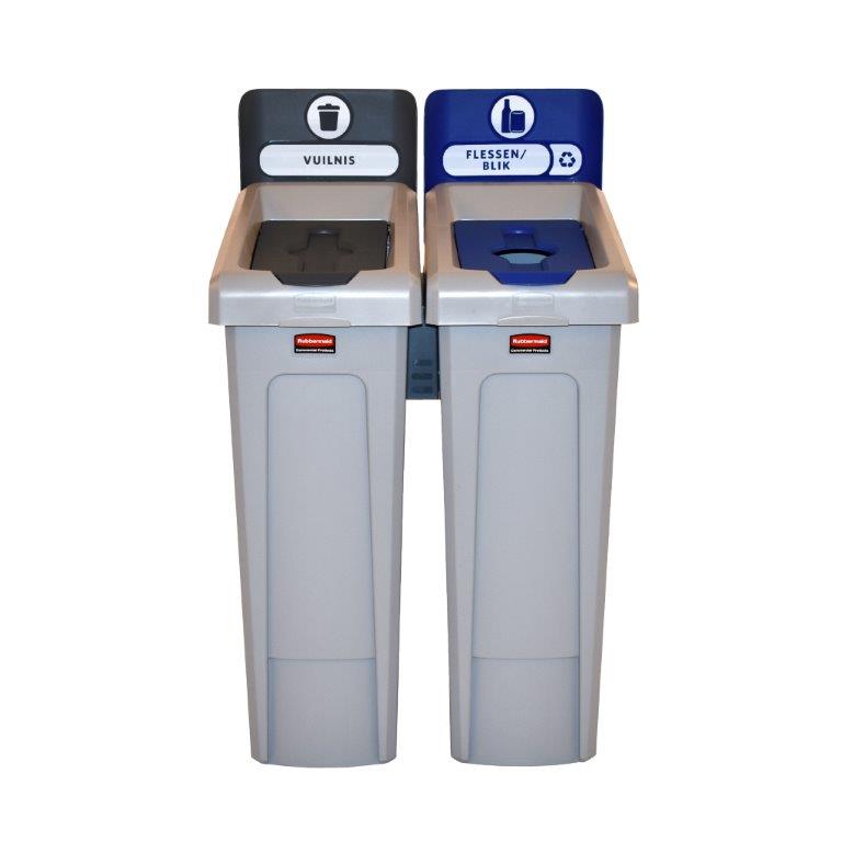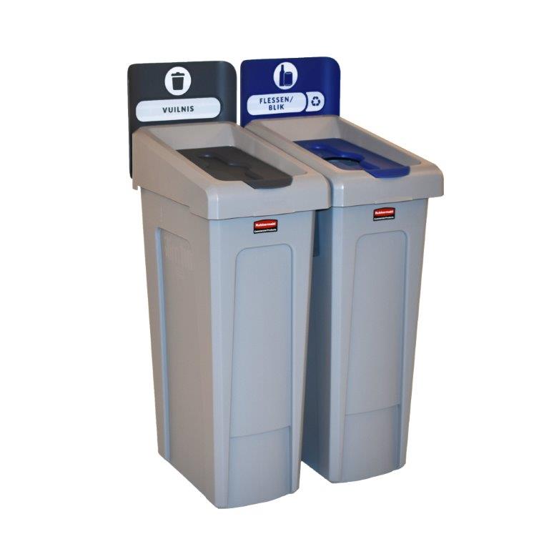 Compleet Slim Jim Recyclingstation voor twee afvalstromen. De set bestaat uit twee koppelbare Slim Jim containers waarvan een container voorzien is van een grijs gesloten deksel en een container met een blauw flessendeksel. De totale set wordt geleverd met bijpassende gekleurde communicatiepanelen en een Nederlandstalige labelset. , VB 181940, L 546 b 610 h 1022, mm