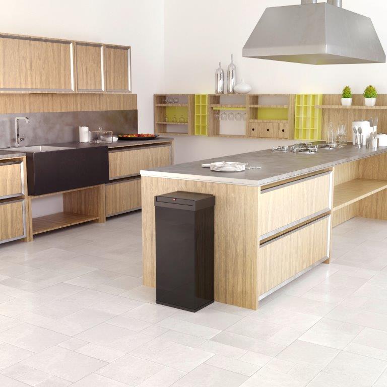 Rechthoekige afvalbak van staal met zelfsluitend, in tweeën gedeeld swingdeksel van kunststof. Met gepatenteerd afvalzak-klemframe. Vlak verpakt, maar snel in elkaar te zetten. , VB 001566, L 260 b 340 h 770, mm