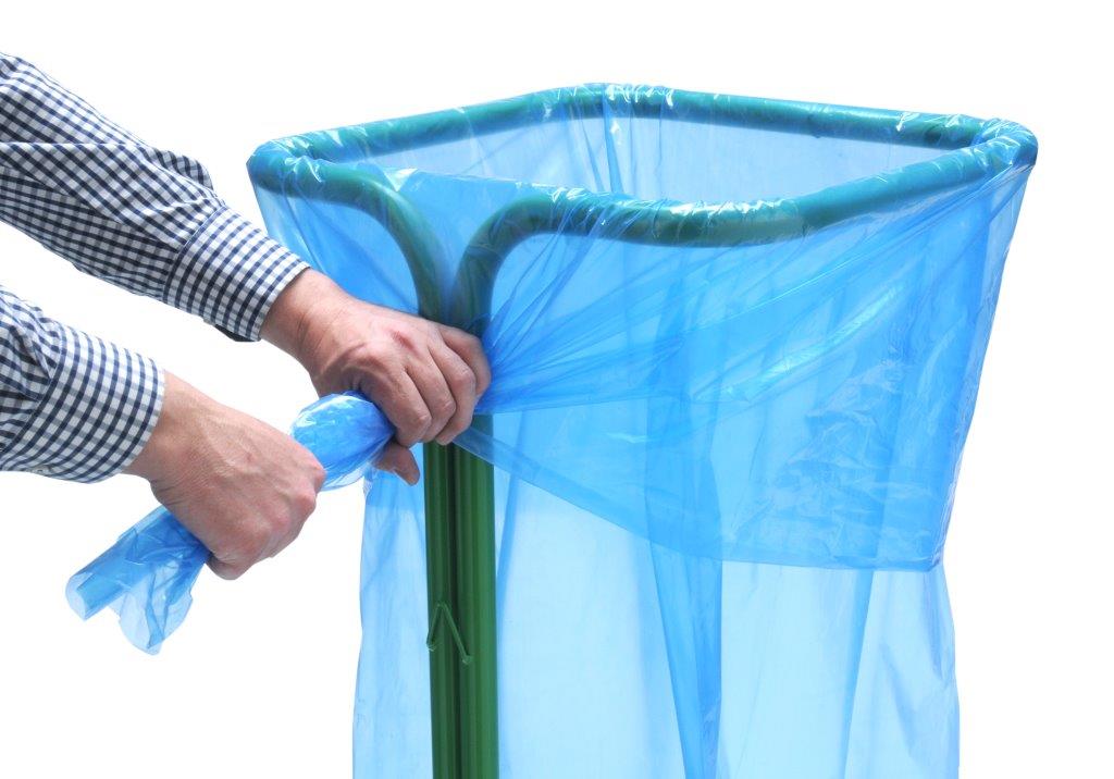 Metalen buisframe voor het inzamelen van folies, kunststoffen of EPS. Uniek zelfklemmend systeem waardoor de afvalzak blijft zitten zonder gebruik te hoeven maken van losse klemmen of clips. , VB 893337, L 695 b 695 h 1700, mm