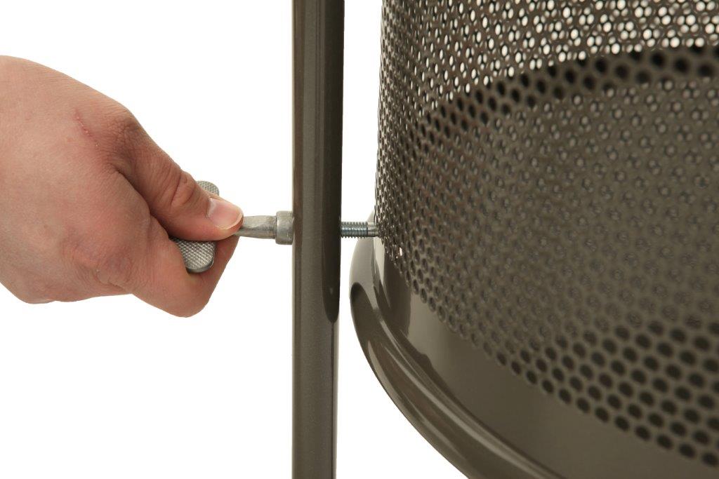 Ronde, gedeeltelijk geperforeerde afvalbak van metaal op statief. De bak kan geleegd worden door het losdraaien van de sluitschroef, de bak is dan kantelbaar. , VB 713000 h 840 ø 460, mm
