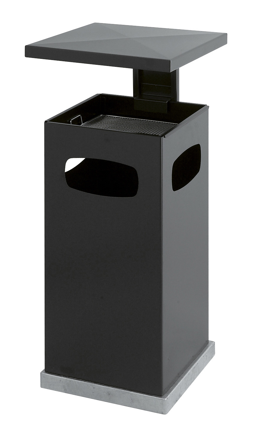 Stalen as-papierbak met afneembaar afdak en drie inworpopeningen. Voorzien van verzinkte binnenemmer, zwarte inzetbak en verchroomde zeef. Inclusief bevestigingsmateriaal voor vloermontage. , VB 201211, L 395 b 395 h 910, mm