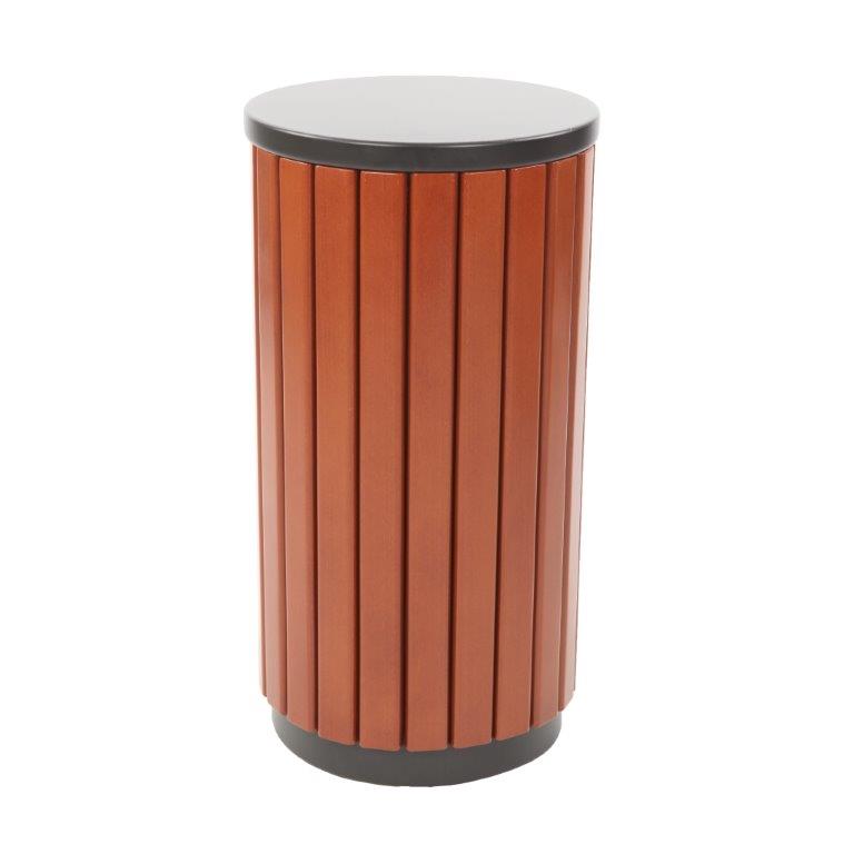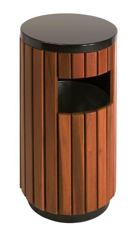 Ronde buitenbak bestaande uit een stalen frame met hout look. Voorzien van verzinkte binnenemmer en 1 inworpopening aan de zijkant (23 x 14 cm). , VB 789458 h 755 ø 400, mm