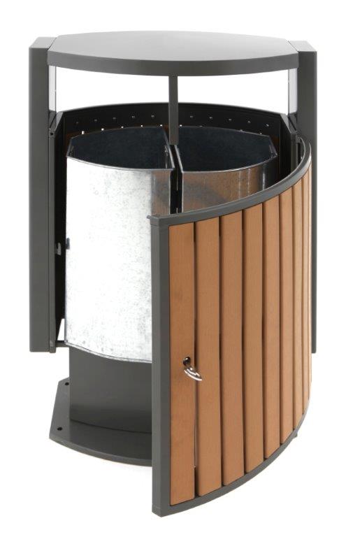 Recycling afvalbak van kunststof 'houtlook’ latten en gepoedercoat stalen frame. Voorzien van regendak en gegalvaniseerde binnenbakken (2x 39 ltr). Afsluitbaar. Te bevestigen aan de grond. , VB 650422, L 400 b 700 h 1000, mm
