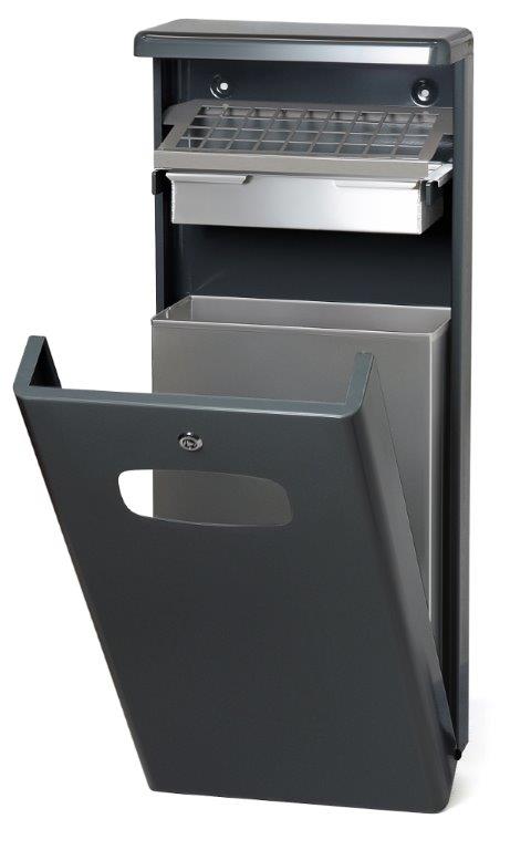 Aluminium afvalbak en asbak met aluminium binnenbak. Voor wandbevestiging. Afmeting binnenbak 36,5x18 cm, hoogte 56,5 cm. , VB 400010, L 190 b 400 h 950, mm