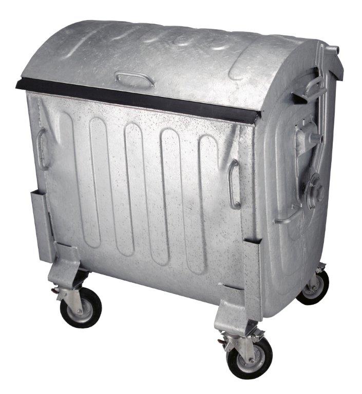 Staalverzinkte container voorzien van bol deksel en 4 wielen. , VB 110050, L 1020 b 1360 h 1420, mm