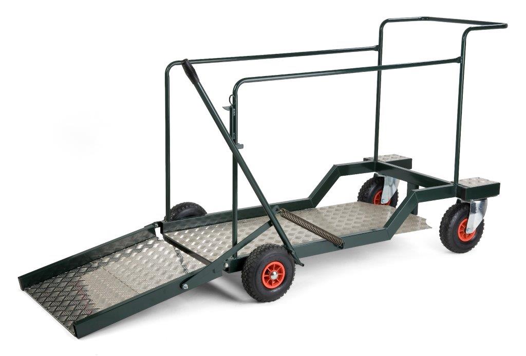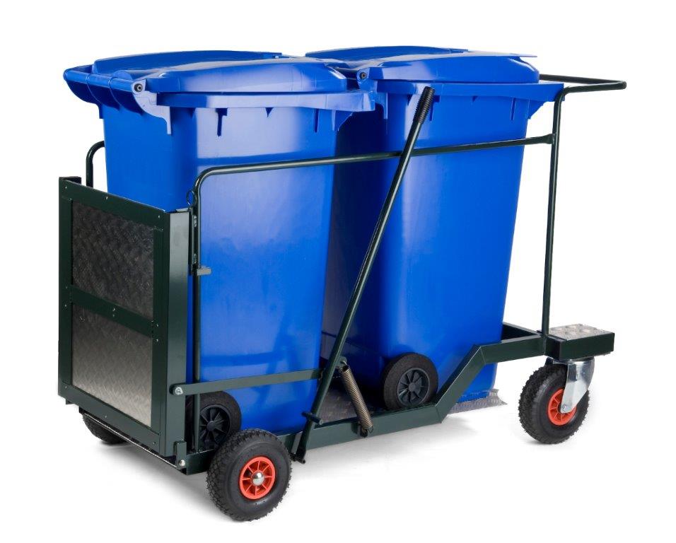 Robuuste stevige transportkar op 4 luchtbanden (waarvan 2 zwenkwielen). De kar is geschikt voor 2 x 240 ltr containers, die eenvoudig via de oprijplaat op de kar gezet of van de kar gehaald kunnen worden. De oprijplaat (65 cm breed) wordt bediend door de hendel aan de zijkant van de kar. Wanneer de oprijplaat naar beneden staat, worden 2 wielen geblokkeerd. Containers apart bestellen (deze zijn in verschillende kleuren leverbaar). , VB 960400, L 1400 b 860 h 1100, mm