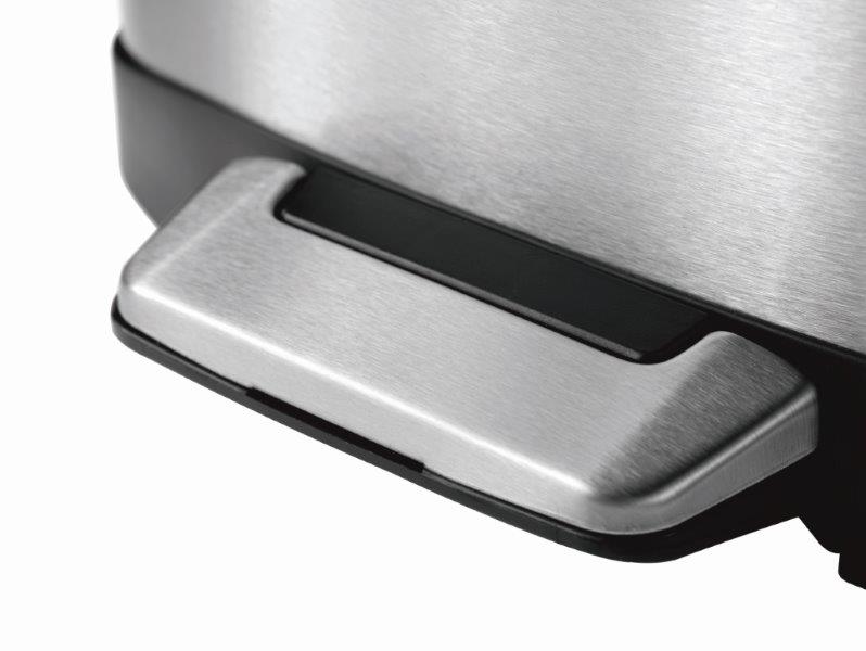 Fraai vormgegeven pedaalemmer van geborsteld RVS met fingerprint proof coating. Voorzien van geruisloos sluitend deksel, kunststof binnenemmer en handgreep aan de achterzijde. De stay-open functie vergrendelt het deksel, voor het makkelijk schoonmaken van de afvalbak of wisselen van de afvalzak. , VB 936635, L 357 b 336 h 638, mm