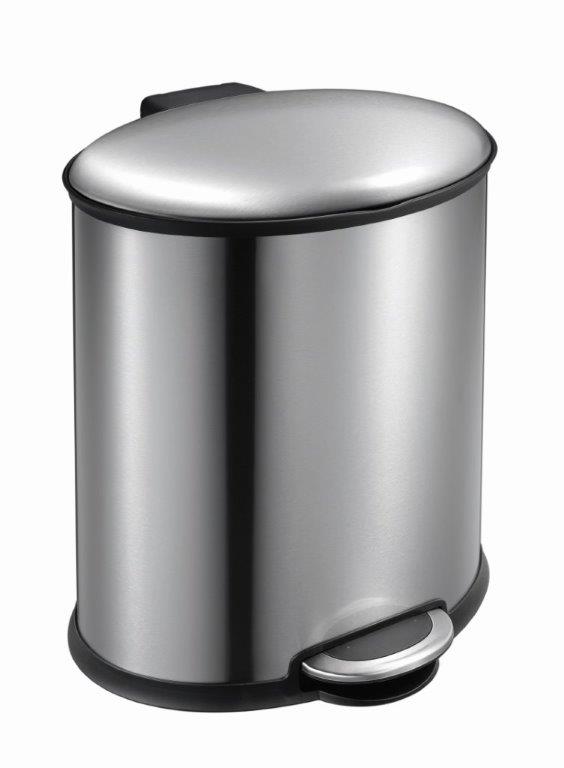 Fraaie ellipsvormige pedaalemmer van geborsteld RVS met fingerprint proof coating. Voorzien van geruisloos sluitend deksel, kunststof binnenemmer en handgreep aan de achterzijde. , VB 932520, L 356 b 325 h 448, mm