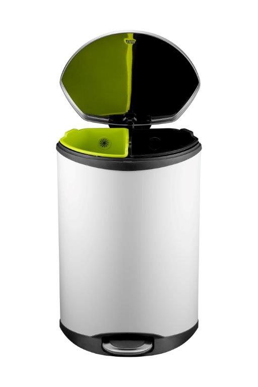 Opvallende schelpvormige pedaalemmer met 2 kunststof binnenemmers (2x 22 ltr) voor afvalscheiding. Voorzien van gedempt deksel en Fingerprint Proof coating. , VB 921844, L 406 b 450 h 690, mm