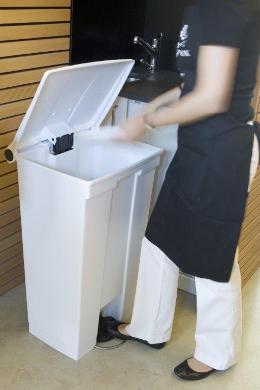 Robuuste container van polyethyleen met stil pedaal voor intensief gebruik. Deze sterke, lek-vaste pedaalemmer uit kunststof roest, deukt, splintert en schilfert niet. Ideaal om afval weg te gooien zonder het deksel te hoeven aanraken. Het strak sluitende, overlappende deksel houdt geurtjes binnen. De container heeft afgeronde hoeken en gladde oppervlakken voor een eenvoudige reiniging en desinfectering. Conform HACCP-richtlijnen. , VB 006146, L 409 b 503 h 831, mm