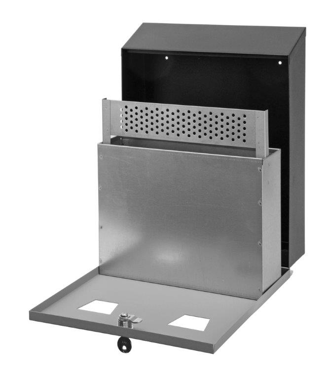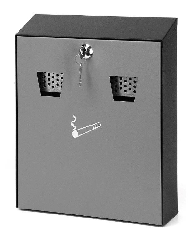 Wandasbak van RVS/gegalvaniseerd staal met metalen binnenemmer. Voorzien van openingen voor de as aan de voorzijde met geïntegreerde doofplaat. Door middel van het slot aan de voorzijde kan de asbak worden geleegd. , VB 041015, L 80 b 260 h 320, mm