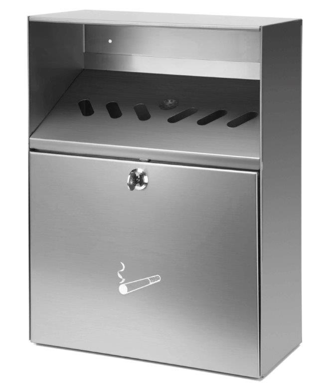 Wandasbak van RVS/gegalvaniseerd staal met metalen binnenemmer. Door middel van het slot aan de voorzijde kan de asbak worden geleegd. , VB 041008, L 140 b 280 h 370, mm