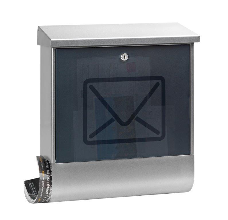 Opvallende brievenbus van gepoedercoat staal of RVS met een transparant gesatineerde deur met envelop design en verchroomd slot. Beschermlaag uit krasvaste lak. De brievenbus is voorzien van openingstop voor het makkelijk en veilig uitnemen van de post. Met geïntegreerd krantenvak onder de brievenbus. , VB 653005, L 115 b 380 h 425, mm