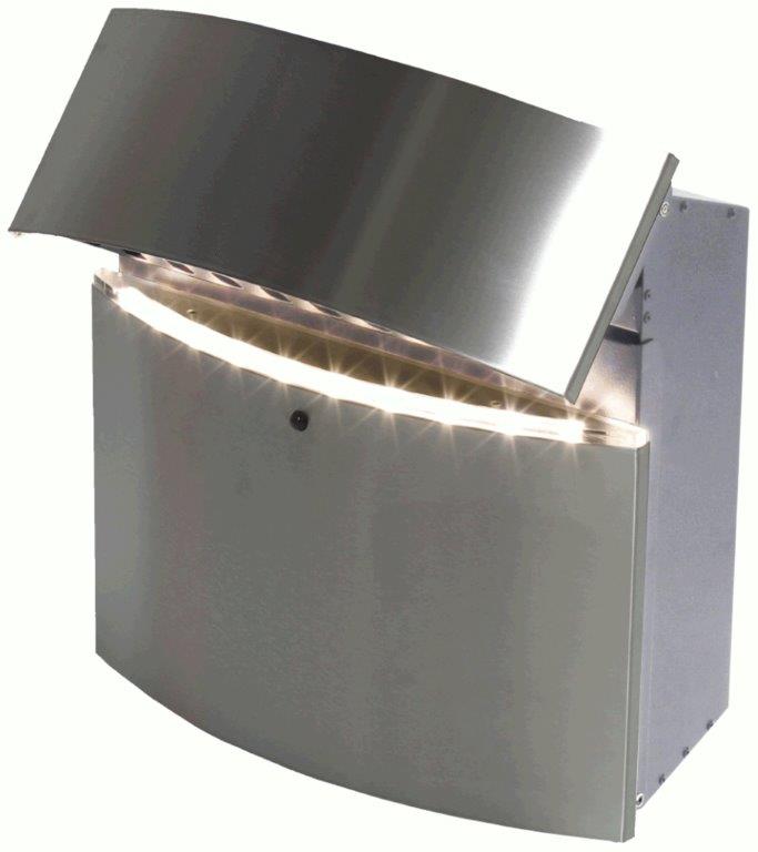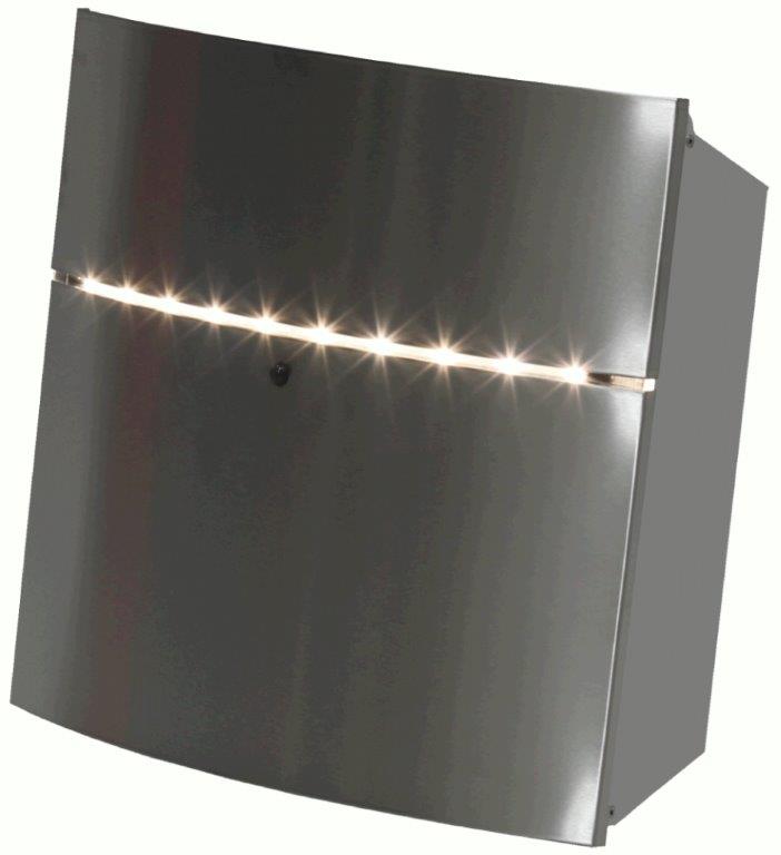 Mooi vormgegeven brievenbus met RVS front en LED verlichting. De inworpopening (37 x 3,8 cm) bevindt zich onder de klep. De verlichting wordt door een sensor en timer geactiveerd en verlicht de brievenbus zowel aan de binnenkant als aan de buitenzijde. , VB 124914, L 184 b 400 h 395, mm