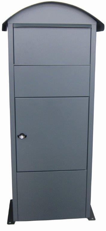 Robuuste, staande brievenbus van gepoedercoat gegalvaniseerd staal. De grote inworpopening (36 x 17 cm) bevindt zich achter de klep. Geschikt voor grotere poststukken en kleine pakketjes. Bij het sluiten van de klep valt de post een verdieping lager in het grote vak dat d.m.v. een cilinderslot afgesloten is. , VB 716968, L 265 b 410 h 1100, mm