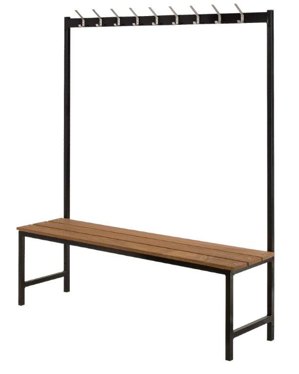 Metalen staande wandgarderobe met 9 dubbele haken en houten zitbank. De garderobe dient aan de muur te worden bevestigd. , VB 200500, L 1600 b 400 h 1800, mm