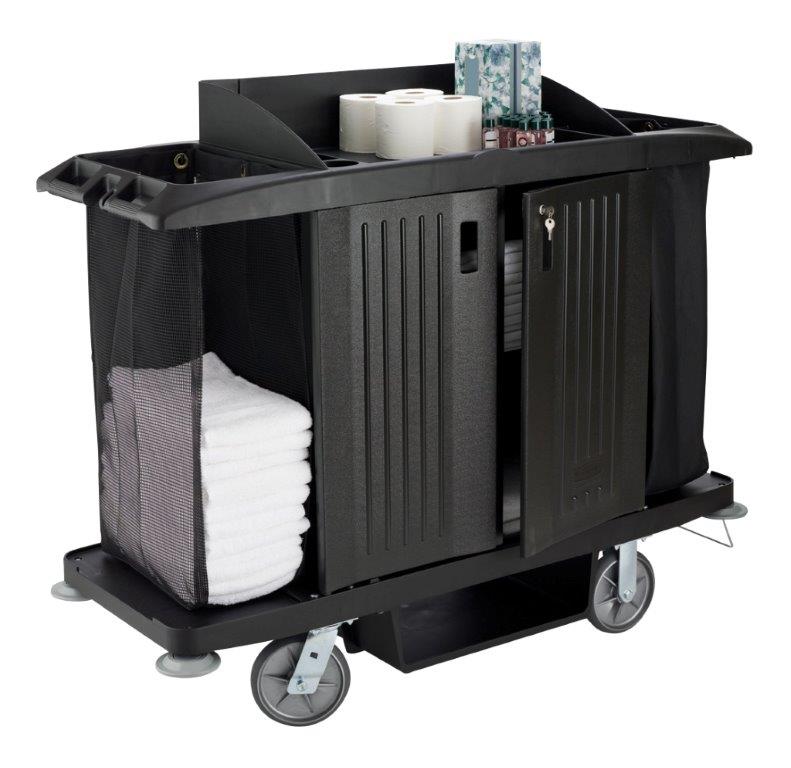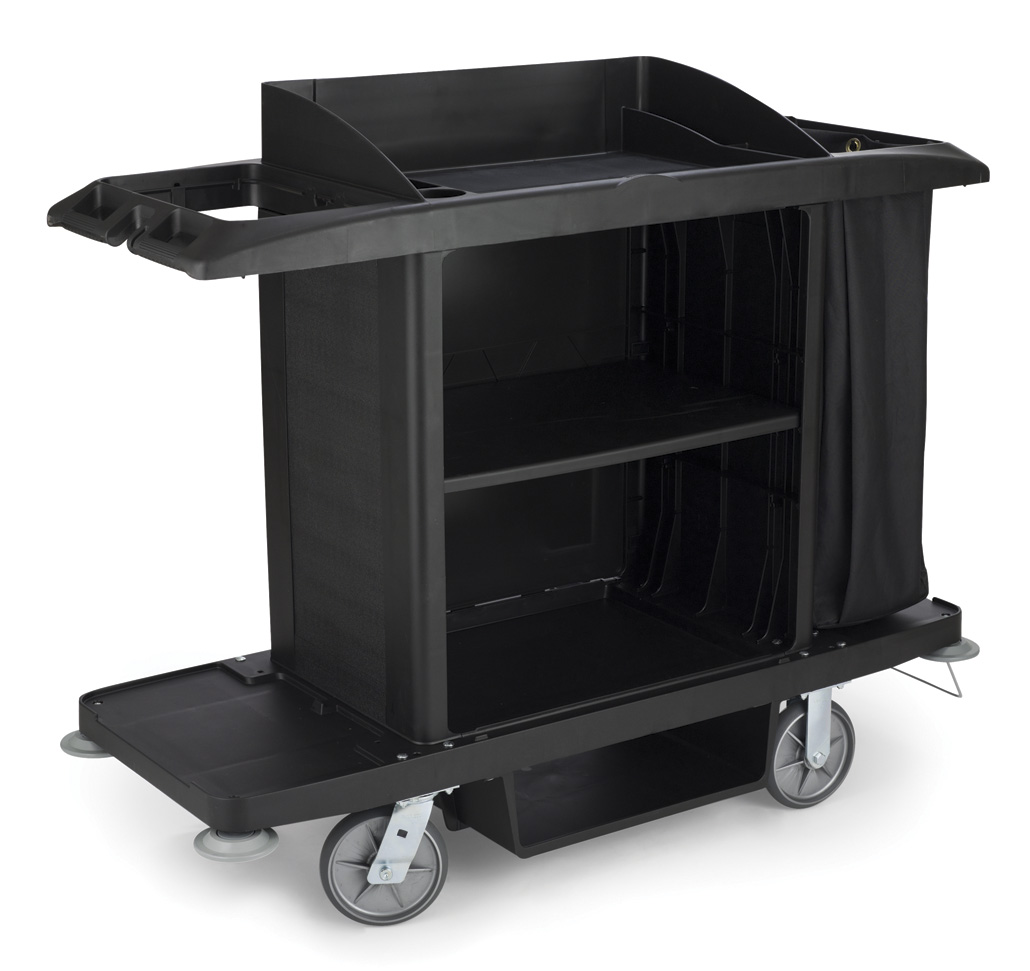 Efficiënte hotelwagen van kunststof met dubbele zakhouder, groot linnen compartiment en haken voor al uw gereedschap. , VB 006189, L 1549 b 572 h 483, mm