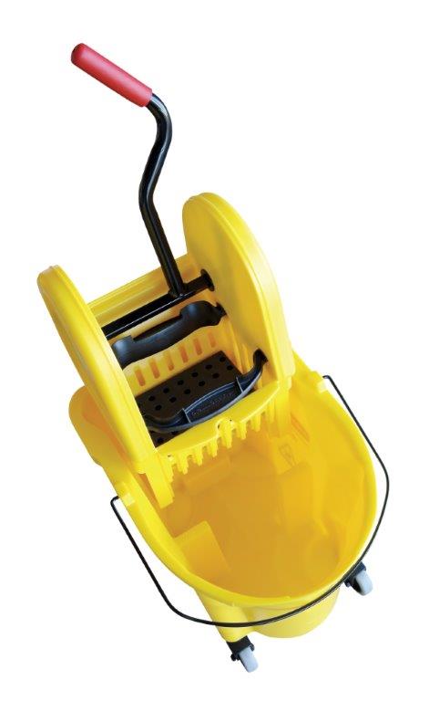 Pers met 33 ltr emmer vervaardigt uit structuurkunststof, speciaal ontworpen tegen het klotsen van vloeistof. Neerwaartse perswringer kan worden gebruikt met strengenmoppen. Voorzien van 4 geruisloze zwenkwielen. , VB 007577, L 422 b 521 h 648, mm
