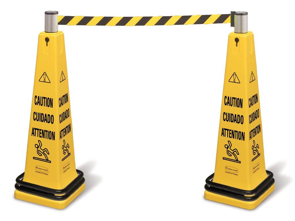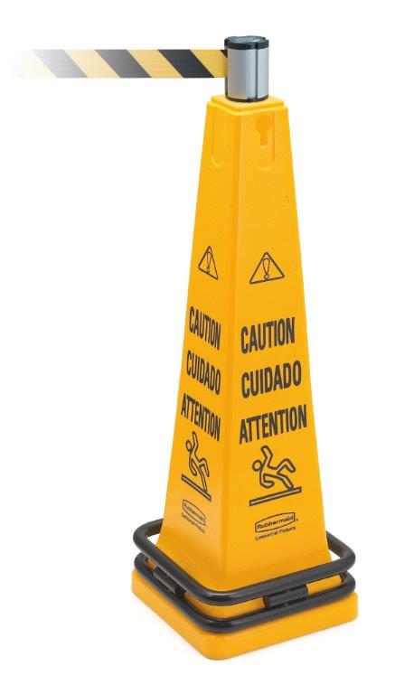 Draagbare barricadekegel, voorzien van een dubbele ballastring en een zelfoprollende band die duidelijk de gevaarlijke plek markeert. De waarschuwingsband kan bevestigd worden aan een andere barricadekegel. Met meertalige waarschuwingstekst en symbool 'wet floor'. , VB 006287, L 318 b 318 h 1011, mm