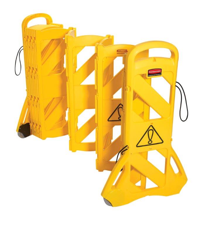 Mobiele barricade voor binnengebruik bestaande uit 16 scharnierende panelen (geopend 4 meter lang) en met 2 wielen die geen sporen nalaten. ANSI goedgekeurde kleur en pictogrammen. Voorzien van 4 sluitriemen om de afsluiting in gesloten positie te vergrendelen. , VB 000911, L 597 b 330 h 1016, mm