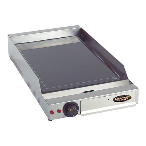 roestvrijstalen ommanteling met een vitro-keramisch braadvlak, bakplaat is zeer snel op temperatuur en voorzien van een thermostaat (50-400°C), hoofdschakelaar, controlelampjes en vetopvangbak. grill:28x44 cm, (h)13x40x61cm, (krachtstroom) 400 volt, 2500 watt