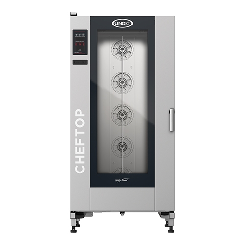 Unox ChefTop Mindmaps One, Combisteamer, de oven heeft een Master Touch bedieningsscherm, hiermee kunnen gerechten handmatig bereid worden, maar het geeft ook toegang tot een lijst met bereidingscycli die eerder zijn opgeslagen of kunnen er nieuwe recepten gemaakt worden, die vervolgens opgeslagen kunnen worden, afstand tussen de roosters is 67cm, DRY.Maxi voor de ideale luchtvochtigheid, Steam.Maxi voor perfect stomen, Air.Maxi voor een perfecte heteluchtcirculatie, automatische reinigingssysteem Rotor.Klean, Auto.Pure-antikalkfilter, wordt geleverd zonder roosters of bakplaten, capaciteit 20x (1/1GN). Afmetingen (h)188x89x102 cm (krachtstroom) 400 volt 29300 watt.