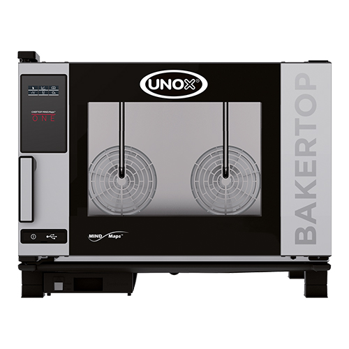 Unox Bakertop Mindmaps One, Hetelucht oven, greep links, de oven heeft een Master Touch bedieningsscherm, hiermee kunnen gerechten handmatig bereid worden, maar het geeft ook toegang tot een lijst met bereidingscycli die eerder zijn opgeslagen of kunnen er nieuwe recepten gemaakt worden, die vervolgens opgeslagen kunnen worden, afstand tussen de roosters is 80cm, Dry.Maxi voor de ideale luchtvochtigheid, Steam.Maxi voor perfect stomen, Air.Maxi voor een perfecte heteluchtcirculatie, automatische reinigingssysteem Rotor.Klean, Auto.Pure-antikalkfilter, wordt geleverd zonder roosters of bakplaten, capaciteit 4x (60x40cm). BakeryNorm. Afmetingen (h)68x86x96 cm (krachtstroom) 400 volt 7400 watt
