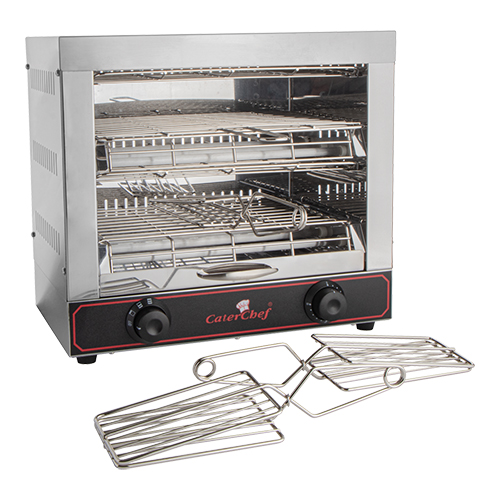 roestvrijstaal 18/10, 2 etages, de elementen zijn apart instelbaar voor bijvoorbeeld het gratineren, voorzien van tijdklok, lekbak, 6 tostiklemmen en 6 quartz buizen. Afmetingen: (h)40x44x25 cm. 230 volt, 3000 watt